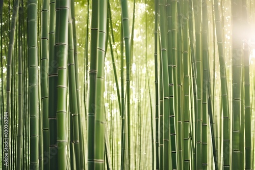 Bamboo forest, sunlight, zen atmosphere, minimalistic design, space for text, Japanese style, nature background, serene vibes, tranquil scene, peace