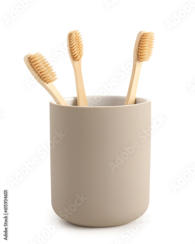 Bamboo tooth brushes in holder on white background
