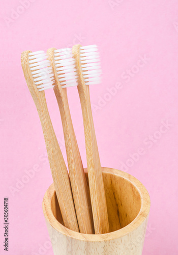 Bamboo toothbrushes on pink background.