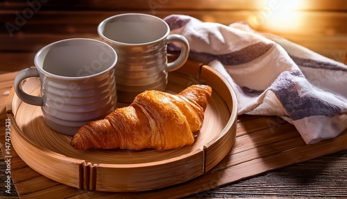 bamboo tray with ceramic cups fresh croissant and dish towel on a wooden table illuminat