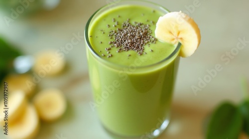 banana and spinach smoothie in a tall glass, showcasing a vibrant green color with a creamy texture