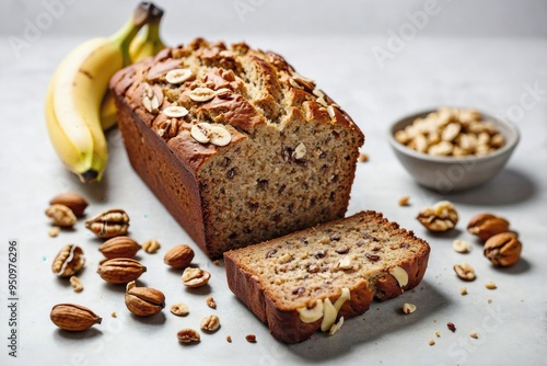 Banana Bread: A loaf of banana bread with a few slices cut off, displayed on a plain white surface.