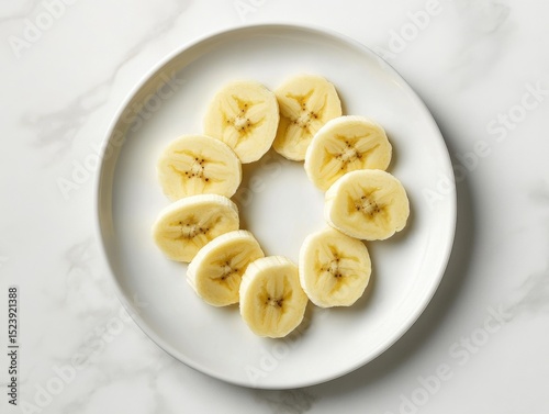 Banana slices arrangement on white plate food photography minimalist kitchen setting aesthetic viewpoint