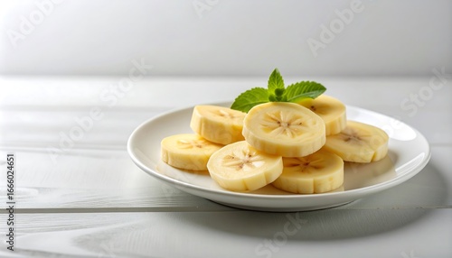 Banana Slices with Fresh Mint on White Plate in Bright Kitchen
