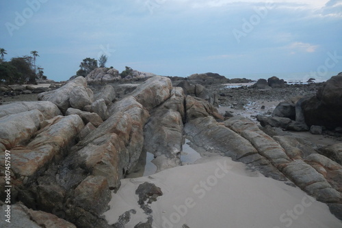 Bangka. Belitung. Bali. Indonesia. Beautiful beach view with large rocks, white sandy beach and rocky formations against bright blue sky, rugged nature