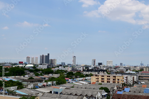 BANGKOK, THAILAND - July 1, 2024 : Landscape View of Bangkok City with Blue sky with white cloud. Clear day and good weather in the morning.
