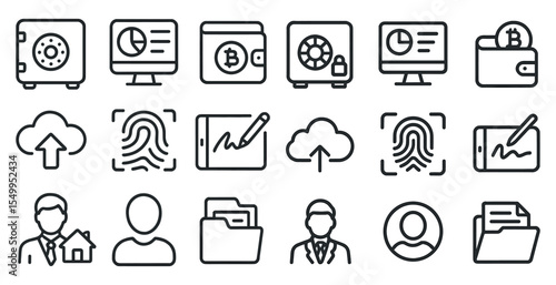 finance, banking, outline, linear, vector, icon, set, financial, security, digital, illustration, technology, business, economy, investment, transaction, currency, billfold, management, savings, data protection, inspecting, calculating machine