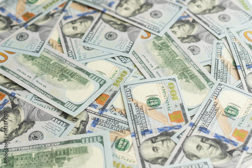 Banknotes of 100 American dollars top view, close-up.