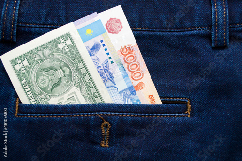 kazakhstan, bank, business, cash, currency, finance, jean, money, paper, pay, pocket, american, concept, credit, dollar, shopping, spend, banknote, bill, buy, closeup, financial, paying, payment, success, symbol, wealth, 1, america, billboard, black, buying, 100, idea, leather, national, purse, rich, safe, billfold, up high, background, blue, casual attire, clothing, colours