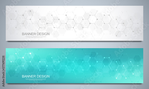 Banner design templates and headers for site with molecular structures background and chemical engineering. Science, medicine and innovation technology concept.