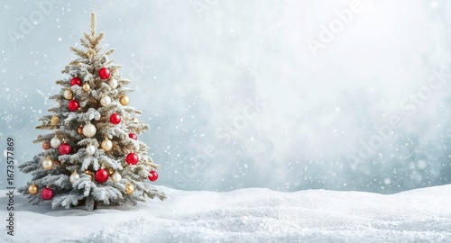 Banner for Christmas. A decorated Christmas tree with ornaments and snow stands in a snowy landscape