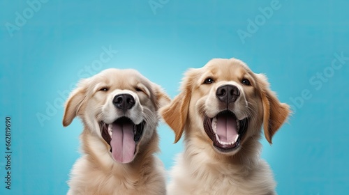 Banner two smiling dogs with happy expression. and closed eyes. Isolated on blue colored background.