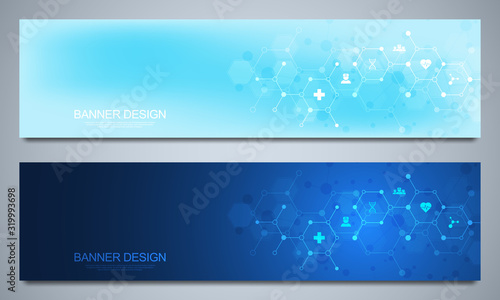 Banners design template for healthcare and medical decoration with flat icons and symbols. Science, medicine and innovation technology concept.