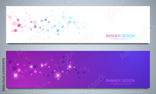 Banners design template with molecular structures and neural network. Abstract molecules and genetic engineering background. Science and innovation technology concept.