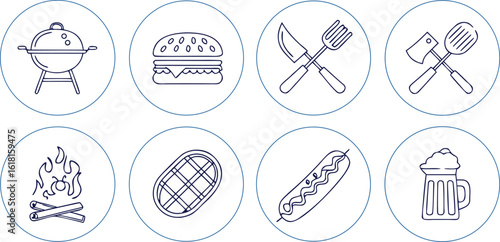 bar-b-q, bar-b-q, icon, line art, blue, grill, burger, steak, hot dog, beer, fire, utensil, knife, fork, spatula, axe, food, drink, summer, cooking, party, picnic, vector, illustration, design, clip art, element, symbol, outline, circle, round, grilling, meat, sausage, campfire, balefire, pint, mug, transparent