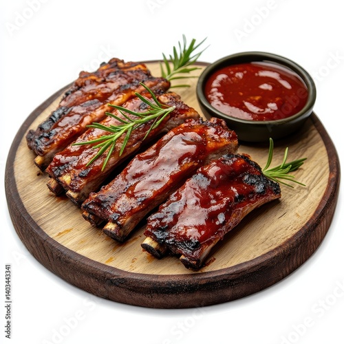 Barbecue ribs with savory sauce served on wooden plate isolated on white background