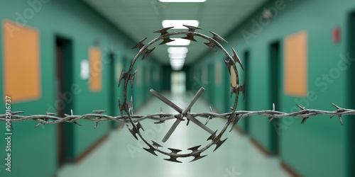 Barbed Wire Fence in Front of Empty Prison Corridor