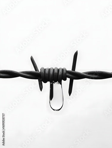 Barbed wire fence with a single water droplet hanging from sharp metal strands isolation