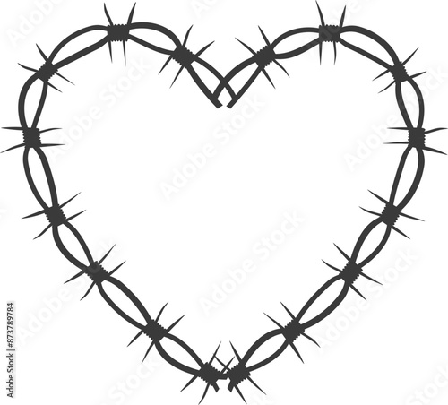 Barbed wire twisted ring y2k, round border tattoo, gothic textured steel frame, spiky oval barrier, silhouette isolated on white background.
