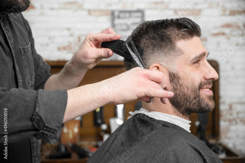 Barber cutting hair with scissors to a handsome young man . High quality photography