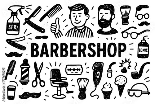 barbershop, barber, haircut, grooming, hair, moustache, beard, scissors, comb, razor, chair, brush, clipper, tonic, spray, style, shave, fashion, salon, accessory, man, male, hairstylist, retro, classic, vintage, profession, shaving, design, doodle, cartoon, black-and-white, line art, hand-drawn, minimal, isolated, transparent, composition, decorative, sticker, clip art