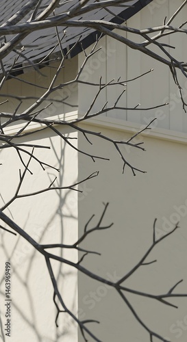 tree, branch, bare, shadow, wall, building, house, siding, exterior, sunlight, monochrome, minimalist, simple, design, architecture, neutral, pale, cream, texture, line, pattern, natural, stark, contrast, abstract, art, image, photo, graphic, background, subtile, serene, calm