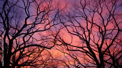 bare, tree, canopy, illustration, winter, silhouette, photograph, branch, deciduous, forest, pattern, pink, orange, purple, hue, leaf, view, network, structural, beauty, scene, quiet, stillness, evening, background, vibrant, intricate