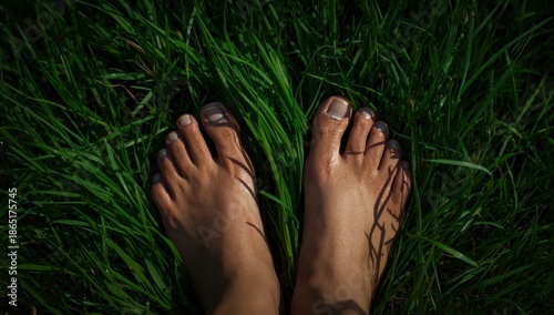 Barefoot Feet Standing on Lush Green Grass with Natural Lighting and Earthy Texture ...