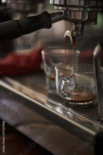 Barista making cup of coffee latte in coffee shop in close up style