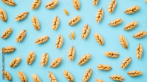 Barley grains arranged in rows on a pale blue isolated background