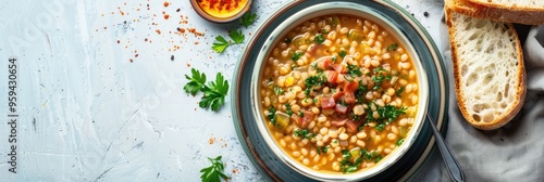 Barley Soup with Smoked Bacon and Fresh Bread on a Light Blue Surface