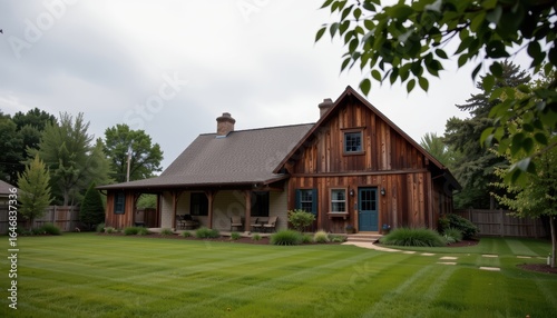 barndominium homes concept. Charming rustic house with a green lawn and trees surrounding it.