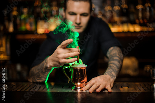 Bartender adding to a cocktail with dried orange a smoked cinnamon in the green light