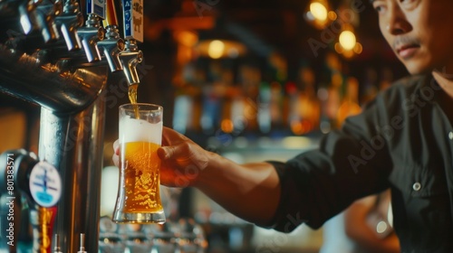 Bartender in a dark shirt pouring a glass of beer from a tap in a warmly lit bar.