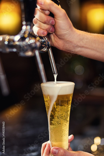 Bartender pouring the fresh beer in pub,barman hand at beer tap pouring a draught lager beer,beer from the tap,Filling glass with beer,fresh beer,pub.Bar.Restaurant.European bar.American bar.