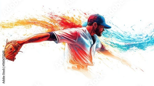 Baseball pitcher in dynamic action pose, vibrant color splash effect.