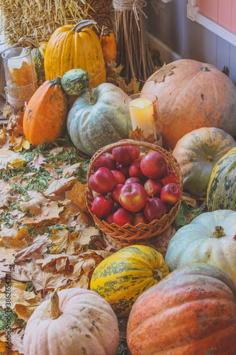 basket with red apples. halloween with pumpkins. pumpkins and squash.