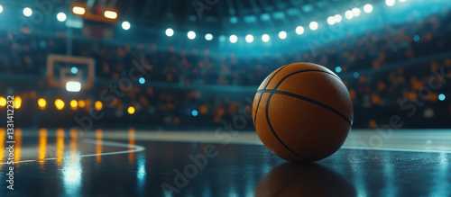 Basketball rests on a gleaming court with a blurred stadium backdrop