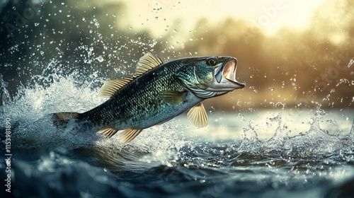 Bass Fish Jumping Out of Water with Splash, AI generated illustration