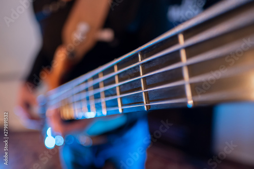 Bass player on a studio recording string closeup macro detail session set blu blur background musician composer creative art idea, improvisation blues jazz rock song