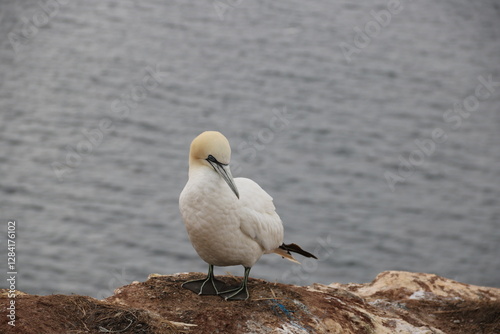 Basstölpel steht auf den roten Klippen über dem Meer auf der Insel Helgoland in der Nordsee