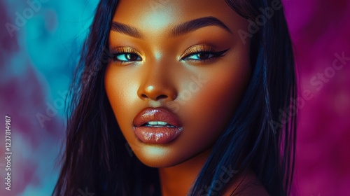 Bathed in a rich blend of colors, a striking multiethnic woman showcases her glossy jet-black hair and captivating features. She exudes confidence and grace in a mesmerizing pose