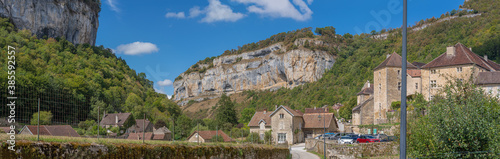 Baume-Les-Messieurs, France - 09 01 2020: View of the village of Baume-les-Messieurs and cliffs behind