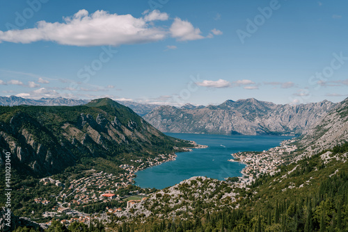 Bay of Kotor in the valley among the mountain range. Montenegro. Drone