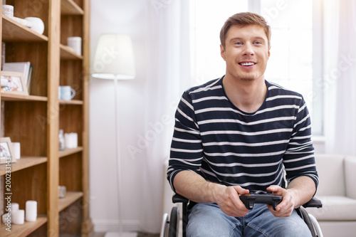Be positive. Cheerful male person expressing positivity while holding playing console in both hands