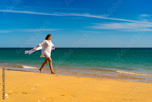 Beach holiday - beautiful woman walking on sunny beach holding shawl