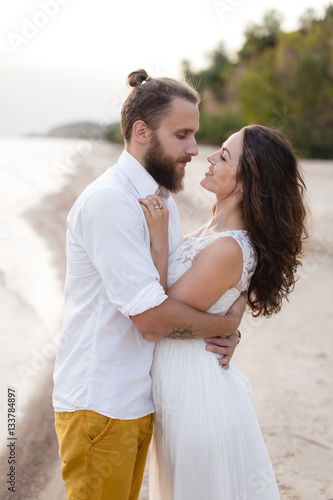 Beach honeymoon couple kissing and hugging on white sand beach. Newlyweds happy in love relaxing on summer holidays. Travel vacation concept.