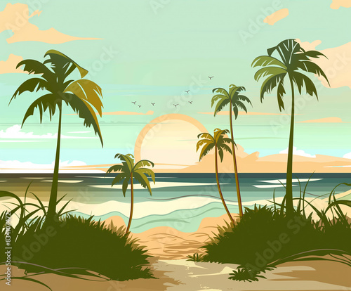 Beach, ocean, palm tress, sun, vector