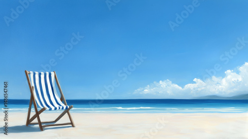 Beach scene with a striped chair on sand, blue sky and ocean waves