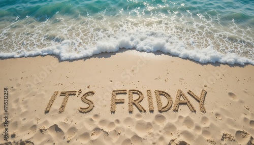 beach shore with waves gently approaching handwritten message on sand it's friday relaxing seaside
